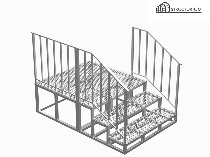 Каркас лестницы выполнен из профильной трубы 40х40 , 40х20 и 20х20 Покрытие ступеней – просечно-вытяжной лист 4мм (может быть заменен на другое покрытие по желанию заказчика) Конструкция имеет съемные элементы перил Покраска полимерная порошковая с предварительным нанесением цинкосодержащего грунта.